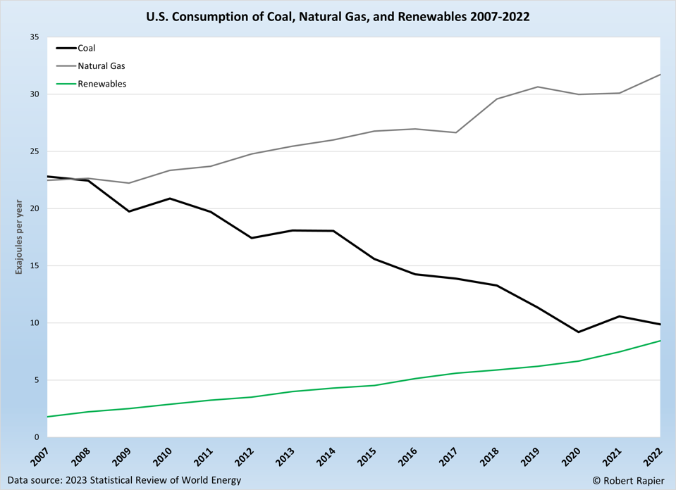 من (نویسنده مقاله) اخیراً خبری با تصویری دیدم که نشان دهنده کاهش مصرف زغال سنگ در ایالات متحده در برابر افزایش مصرف انرژی های تجدیدپذیر ایالات متحده است، این گرافیک باعث می شود به نظر برسد که انرژی های تجدیدپذیر دلیل کاهش مصرف زغال سنگ هستند.